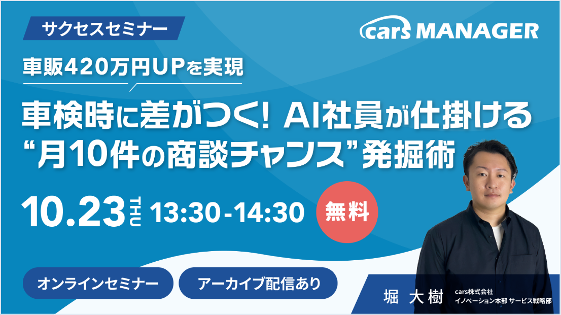 - 車販420万円UPを実現 車検時に差がつく! AI社員が仕掛ける“月10件の商談チャンス”発掘術