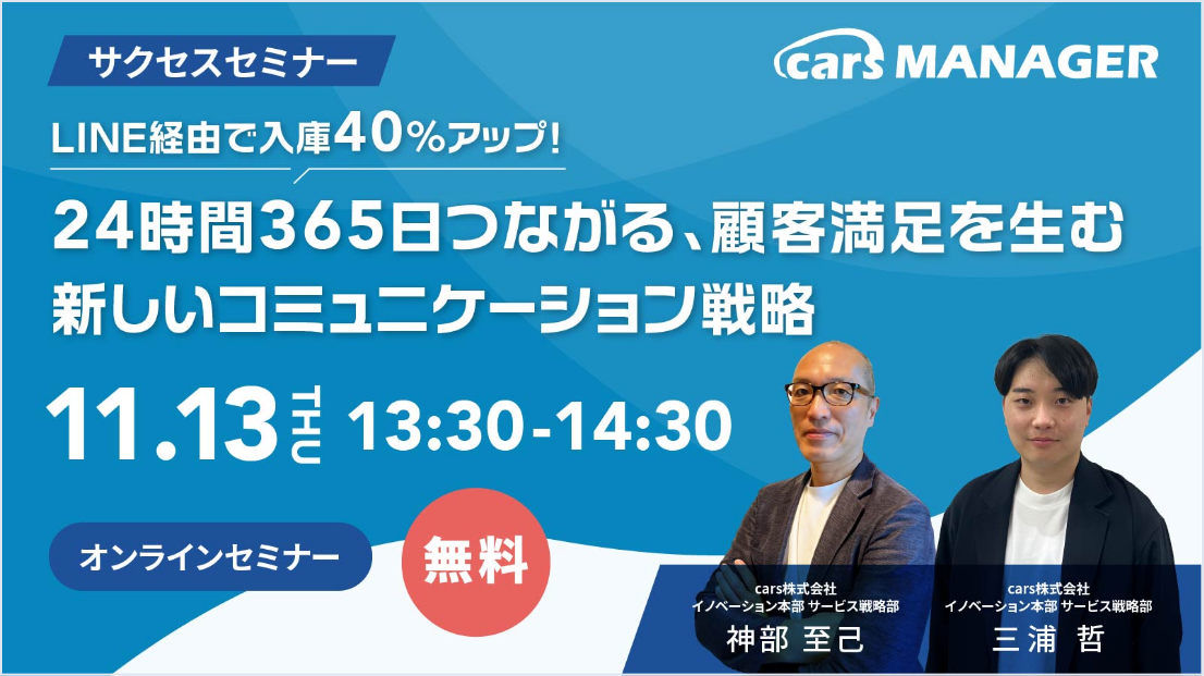 サクセスセミナーでわかること 「電話がつながらない」時代における顧客対応の最新トレンド LINEチャットを活用して入庫数を40%アップさせた具体的事例 24時間365日対応を可能にする予約システムの仕組み 顧客満足(CX)を高め、固定客を増やすコミュニケーション設計のポイント