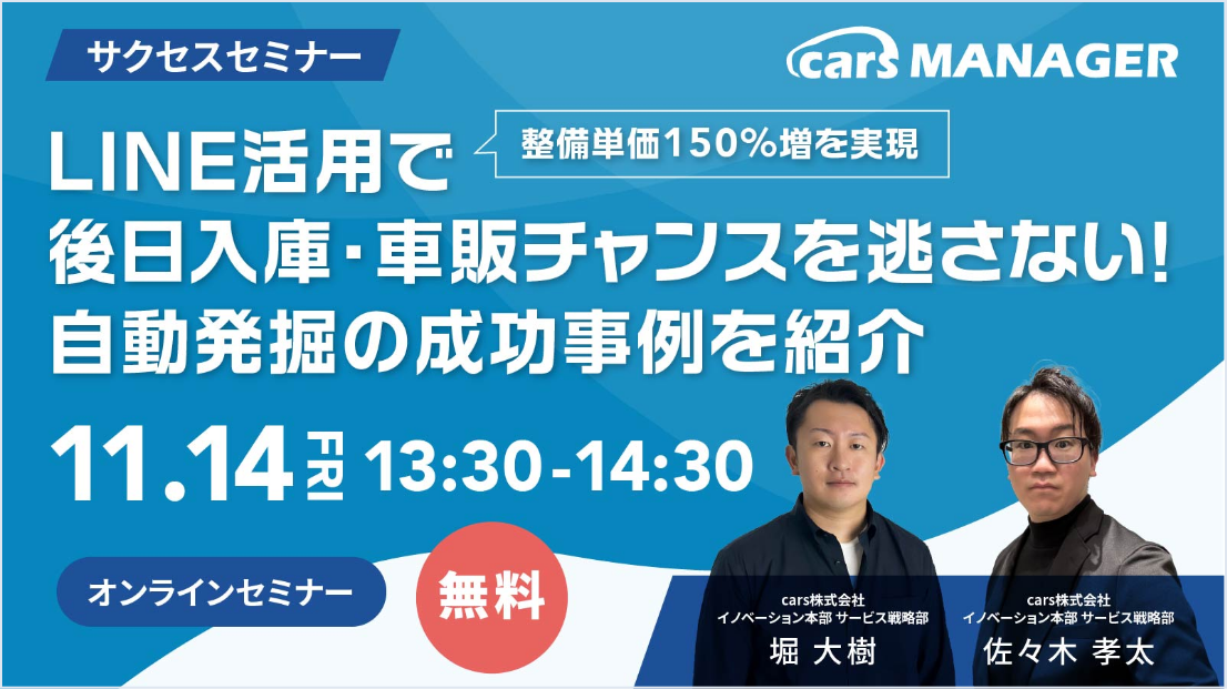 サクセスセミナーでわかること 整備単価を150%向上させた実際のLINE活用事例 後日入庫・車販チャンスを自動で発掘する仕組みの構築法 属人的な営業に頼らず、再来店・販売につなげるコミュニケーション設計 デジタルに不慣れな現場でも無理なく導入できる実践ステップ