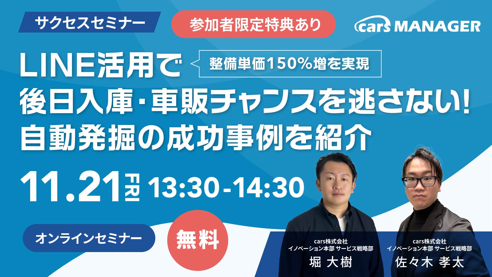 サクセスセミナーでわかること 整備単価を150%向上させた実際のLINE活用事例 後日入庫・車販チャンスを自動で発掘する仕組みの構築法 属人的な営業に頼らず、再来店・販売につなげるコミュニケーション設計 デジタルに不慣れな現場でも無理なく導入できる実践ステップ