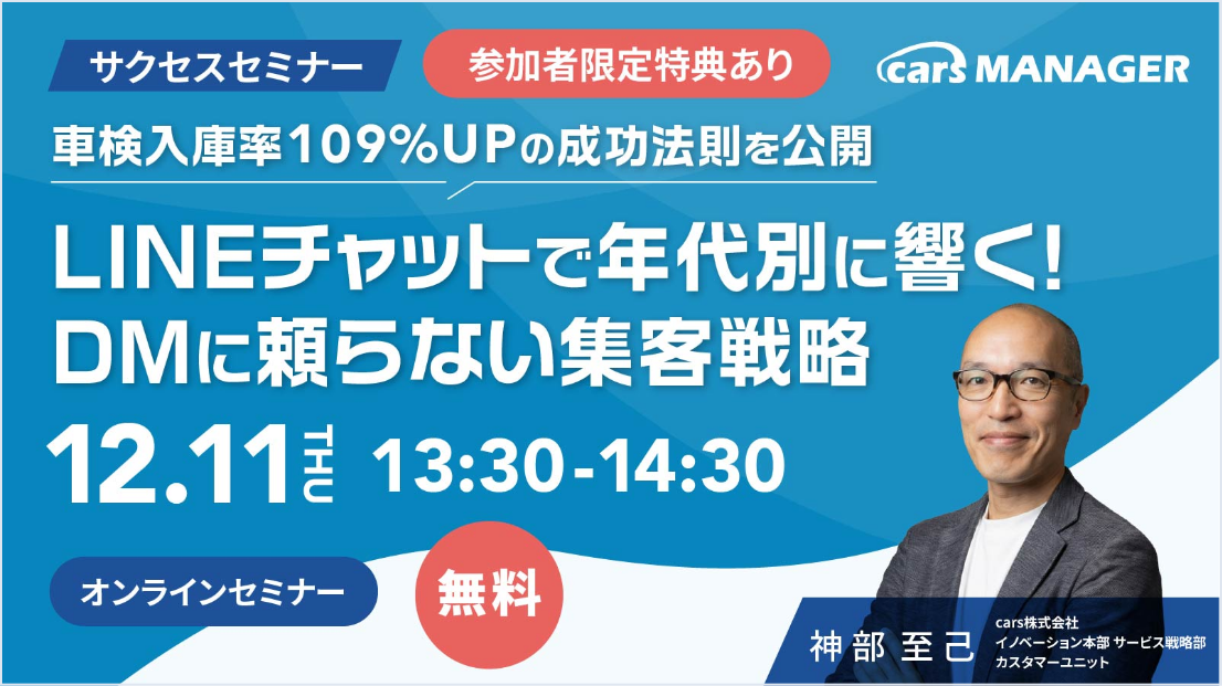 こんな方にオススメ 車検時の商談率を上げ、車販収益を伸ばしたい整備事業所の経営者 少人数でも効率的に販売チャンスを増やしたい販売責任者 営業の属人化をなくし、仕組みで車販を安定化させたい方 AIやDXを取り入れ、現場の成果につなげたい経営者、マネージャー