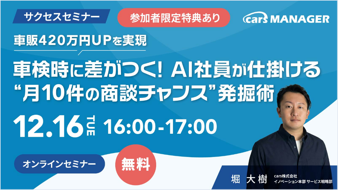 サクセスセミナーでわかること 車検時に潜む「商談機会」を逃さず拾うための最新手法 月10件の商談を自動で生み出す “AI社員”の仕組みと実例 420万円の車販増加を実現した整備事業所の具体的な成功パターン AIを活用した“質問術”で、顧客ニーズを自然に引き出す方法