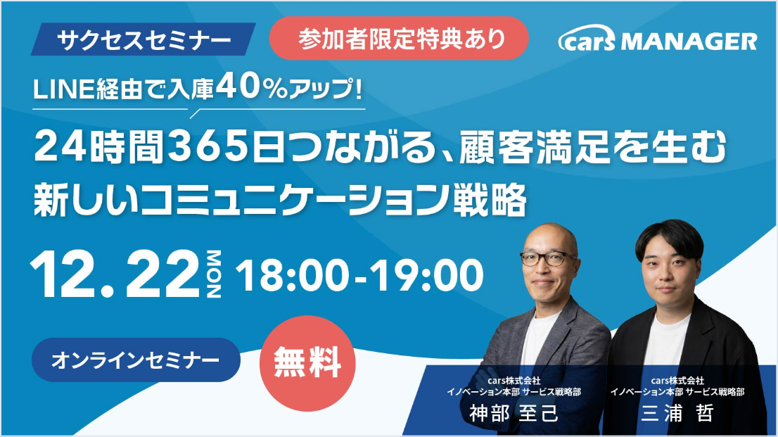 サクセスセミナーでわかること 「電話がつながらない」時代における顧客対応の最新トレンド LINEチャットを活用して入庫数を40%アップさせた具体的事例 24時間365日対応を可能にする予約システムの仕組み 顧客満足(CX)を高め、固定客を増やすコミュニケーション設計のポイント