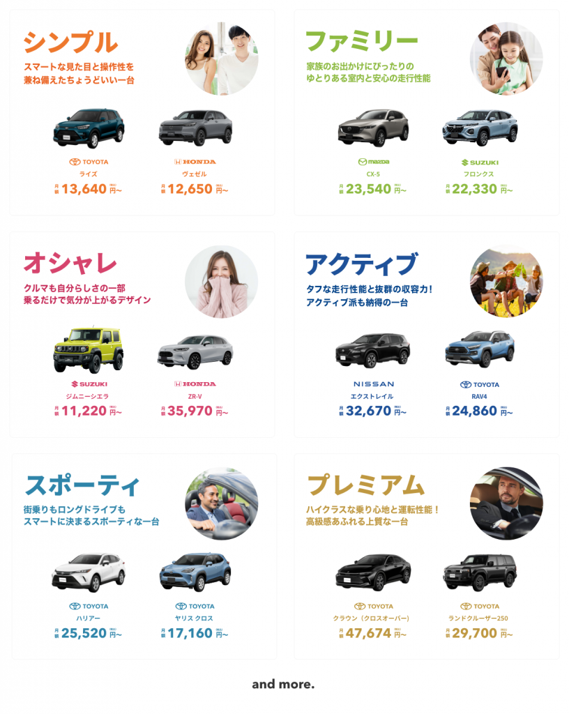 「cars マイカー定額」は全メーカー・全車種ラインナップの新車を取り揃え。月々の全てコミコミのカーリースによるエンジョイ&スマートなマイカー購入をサポートするサービスです。