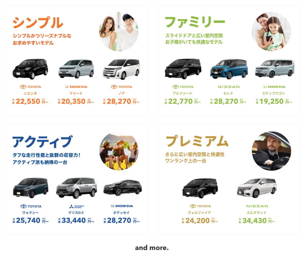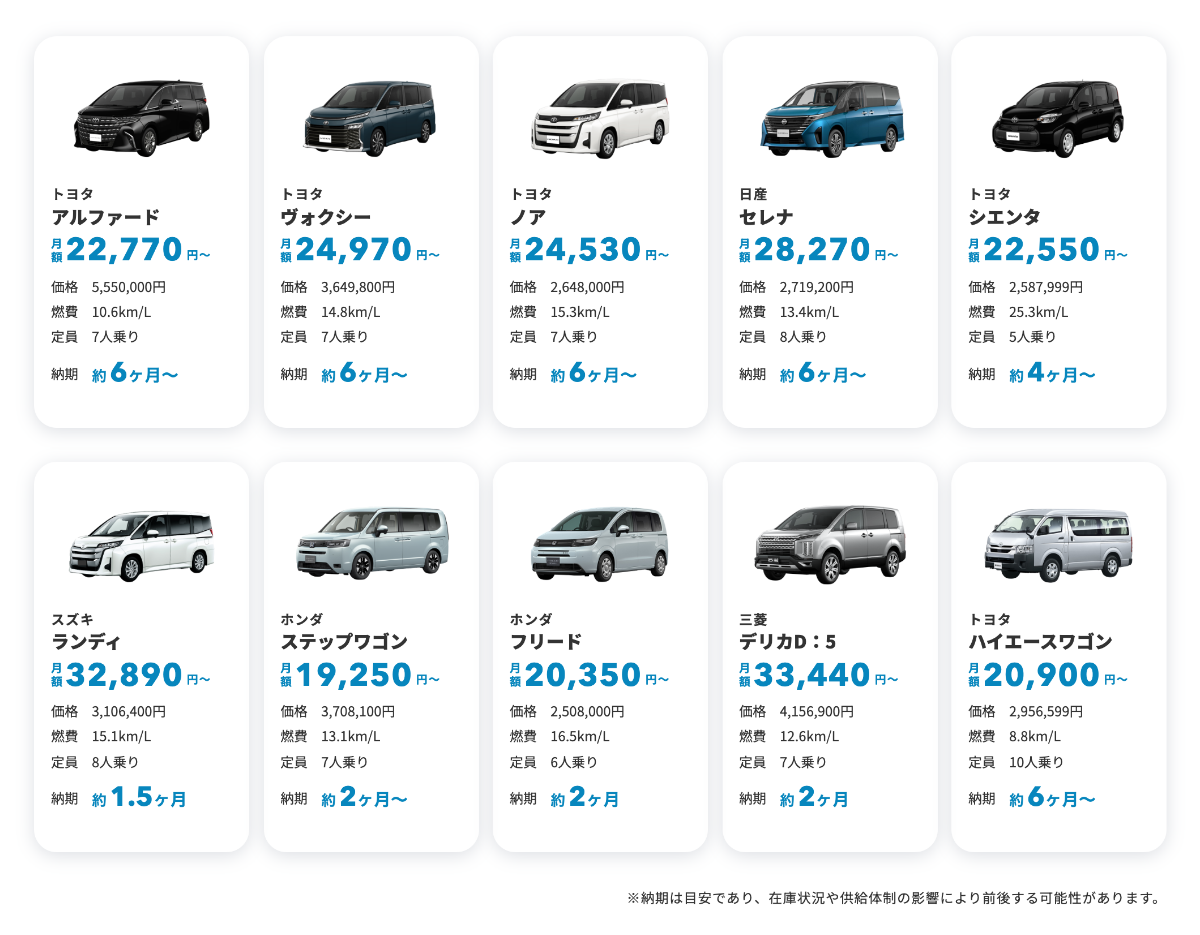 欲しいミニバンの新車をおトクにスマートに「carsマイカー定額」のスペシャルサイトを公開しました。トヨタ、スズキ、ホンダなどの国産車や輸入車など街乗りからアウトドアまで幅広いライフスタイルに応える人気ミニバンをラインナップ。パソコンやスマホから料金シミュレーションや申し込みまでワンストップで、ミニバンのあるカーライフをスマートにお届けします。