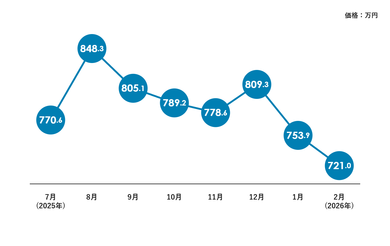 2025年8月に848万円まで上昇しましたが、その後は緩やかな下落基調へ。