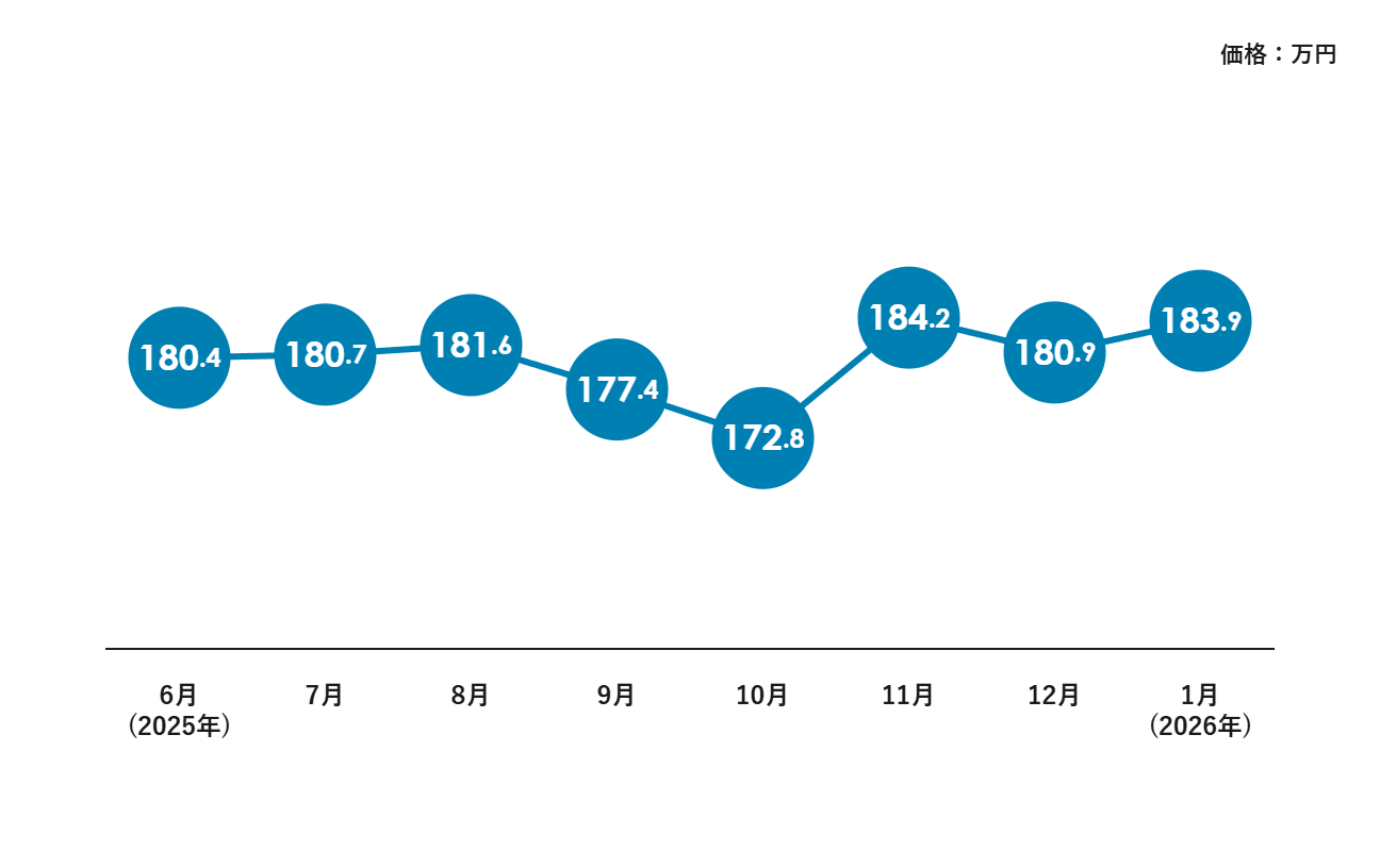 2026年1月は183.9万円と高い位置で踏みとどまっており、これは春の繁忙期に向けた相場の下支えとして非常にポジティブな推移です。