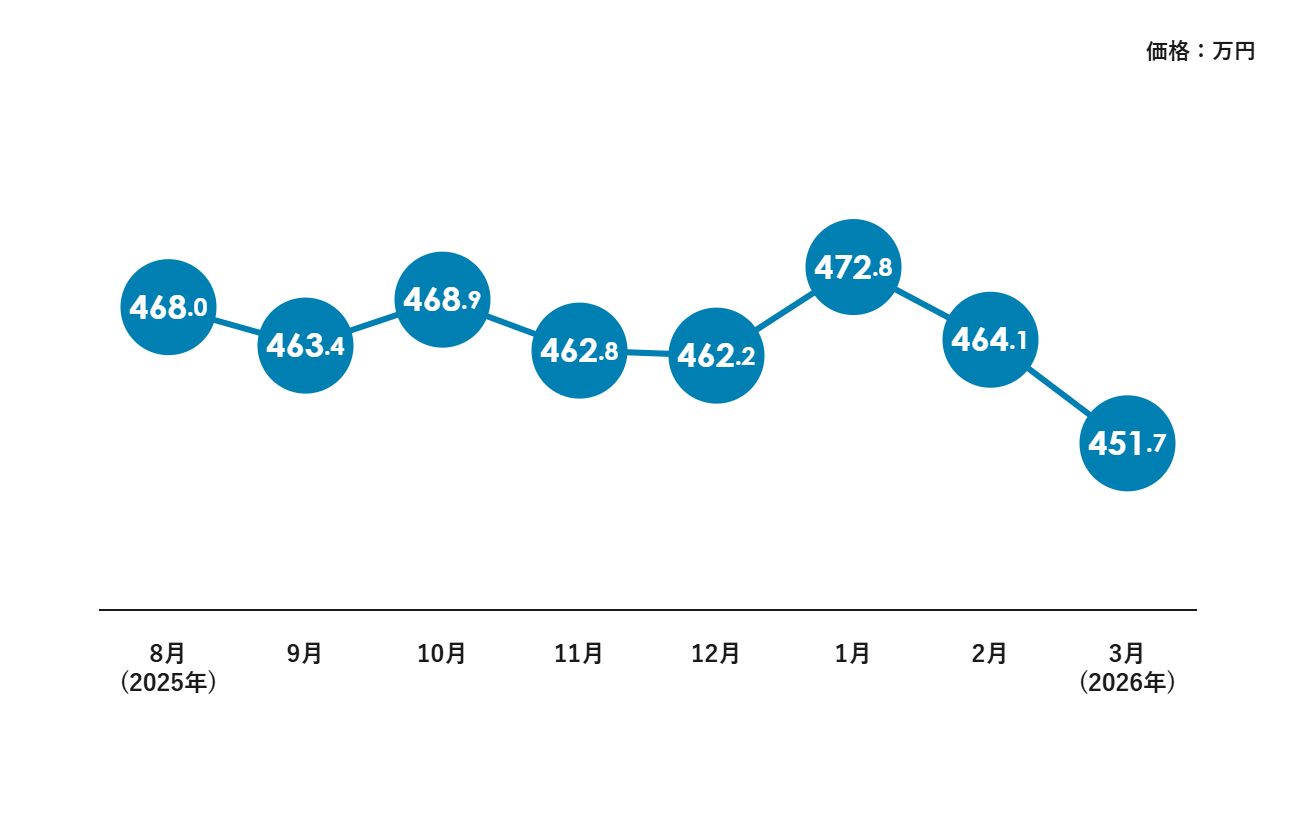 データ開始の2025年8月の468万円と比較すると、現在は約16万円の下落となっています。2026年1月には472万円まで上昇しましたが、その後は下落に転じています。