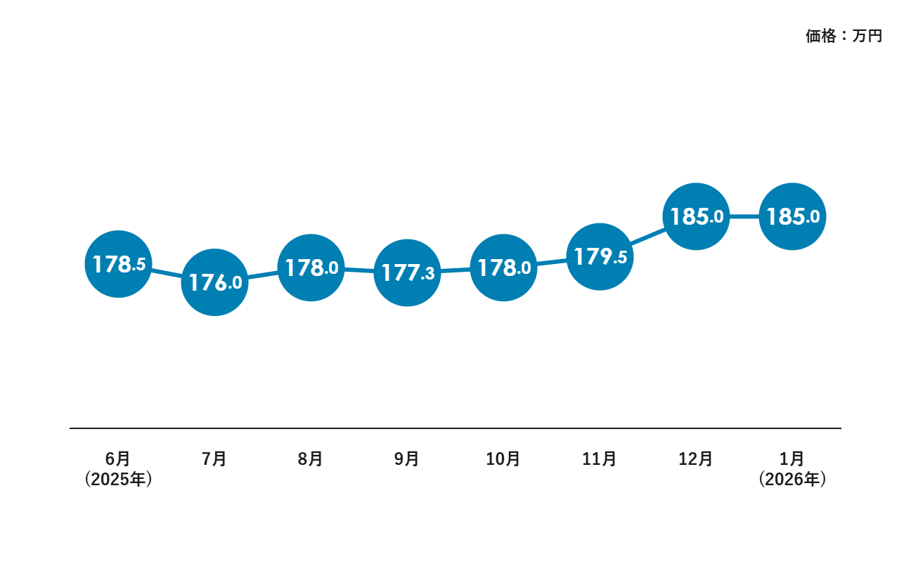 2026年1月も185.0万円を維持しており、これは年末の上昇が決して一時的なものではなく、市場において強い支持を得ている証拠です。