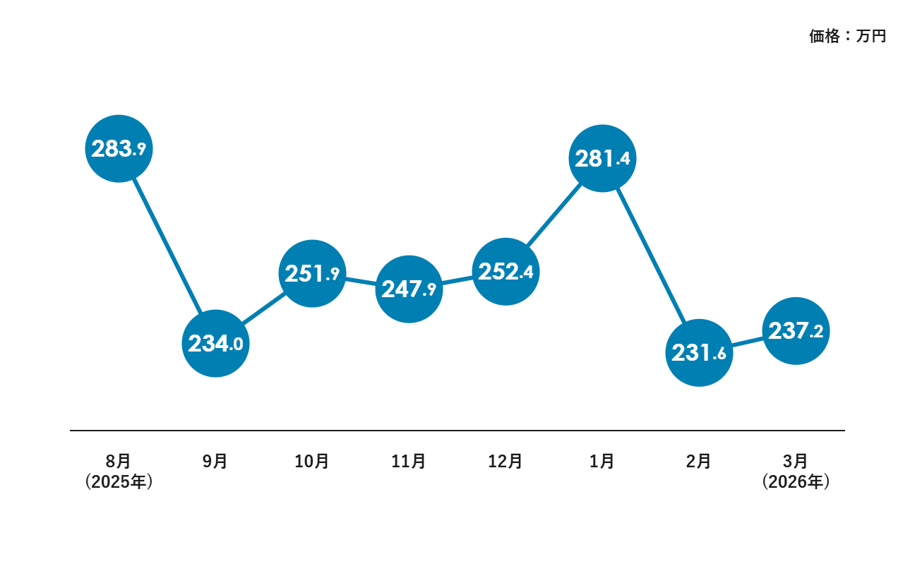 2026年1月には281万円まで上昇しましたが、2月に再び231万円まで下落し、3月は小幅回復しています。