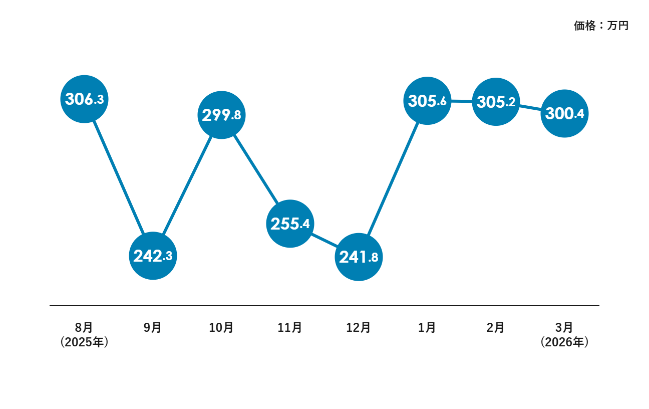 2026年1月以降は300万円台前半で推移しており、相場はやや安定しつつあります。