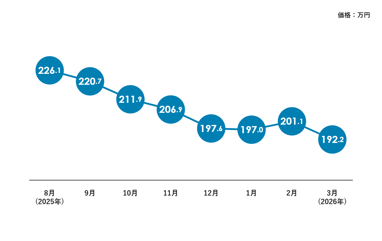 2025年秋以降は継続的な価格調整が続いており、現在は190万円台前半まで下落しています。