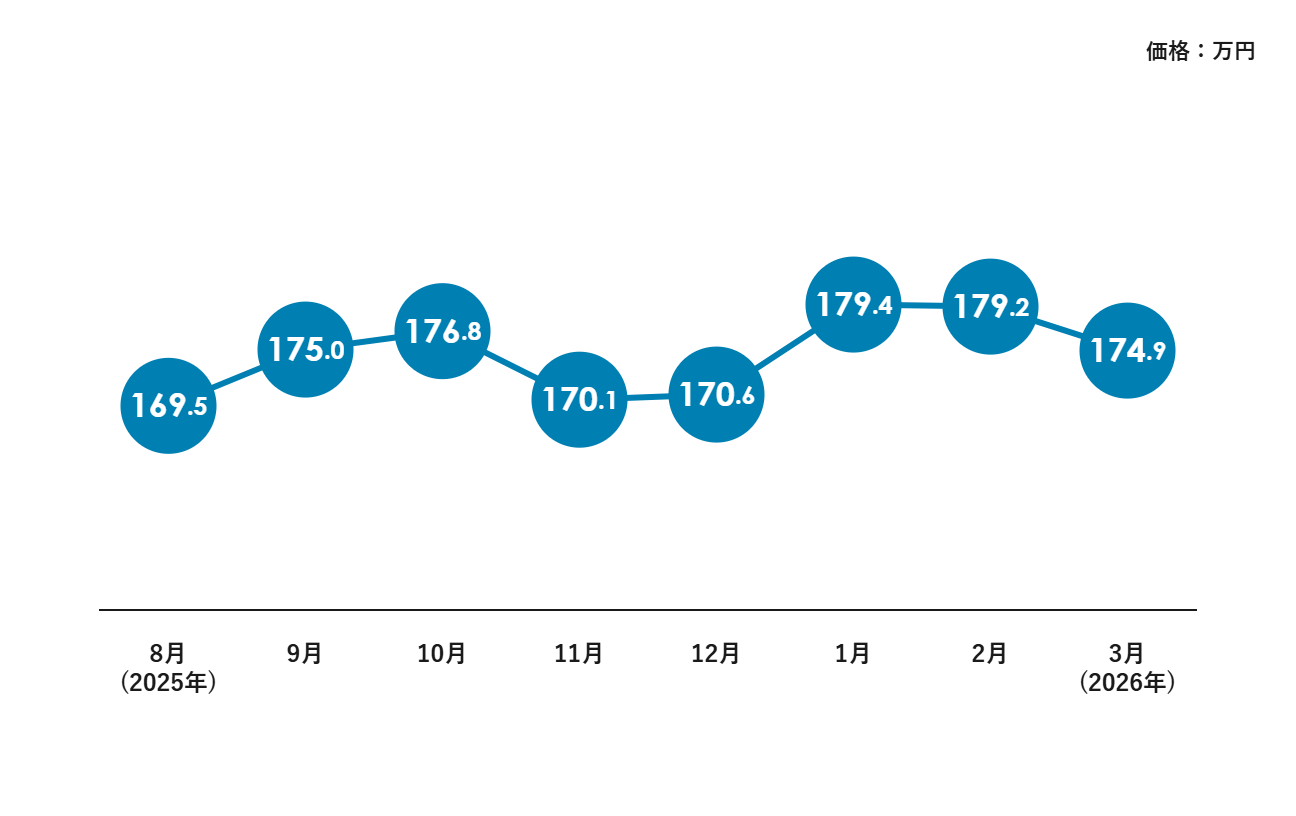 データ開始の2025年8月の169万円と比較すると、現在は約5万円の上昇となっています。2025年秋にかけて相場は一度上昇し、その後は170万円前後で上下を繰り返す動きになっています。