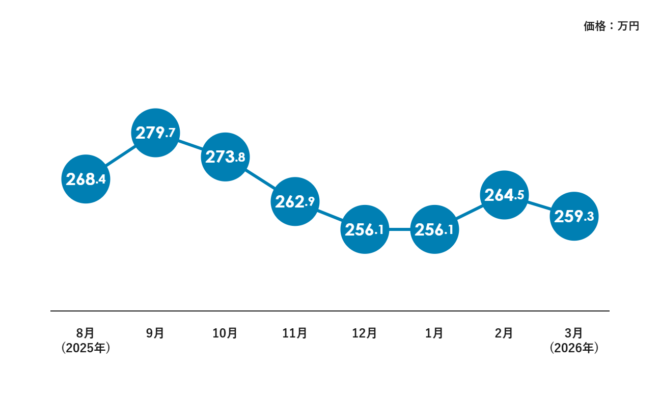 データ開始の2025年8月の268万円と比較すると、現在は約9万円の下落となっています。2025年9月には279万円まで上昇する場面もありましたが、その後は段階的に価格調整が進み、現在は250万円台後半で推移しています。
