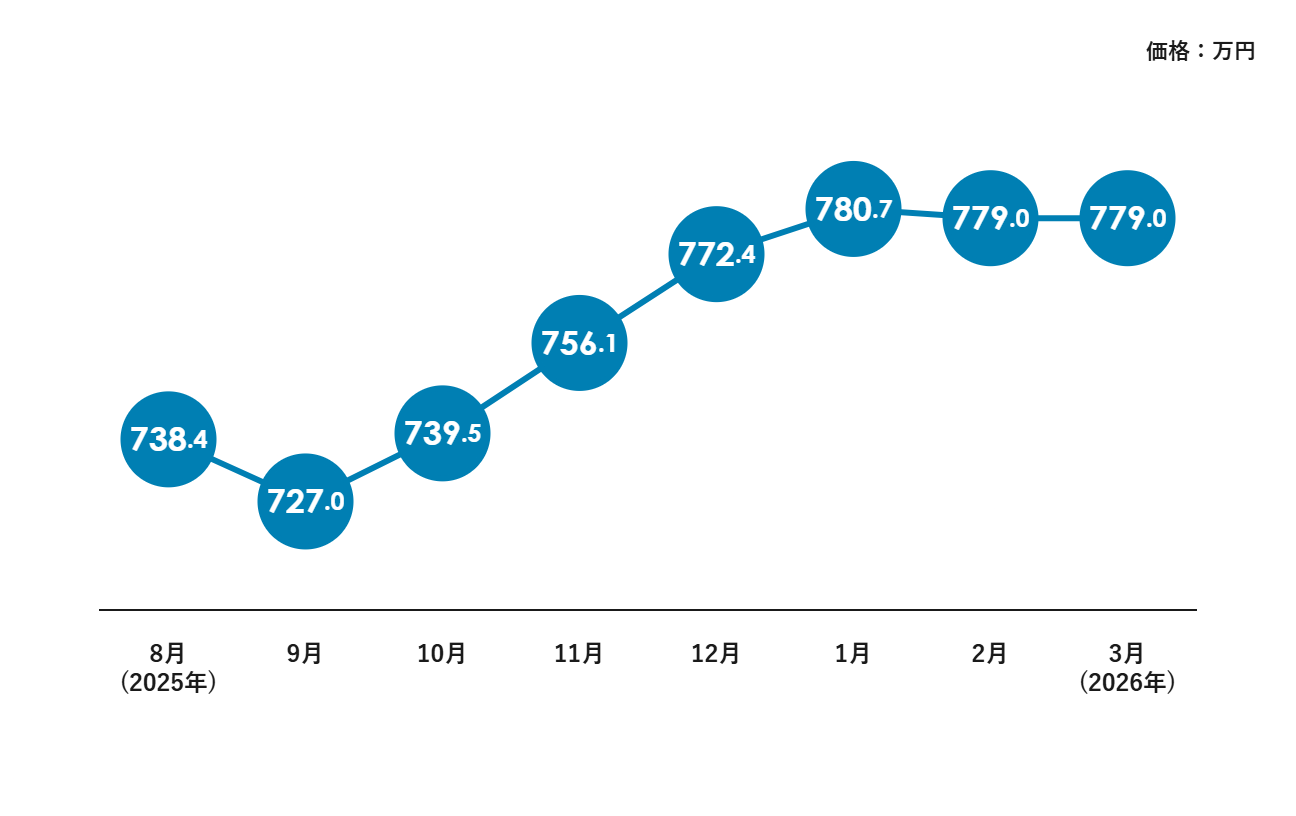 特に2025年11月以降は価格上昇が加速し、2026年には780万円前後の水準に到達しました。