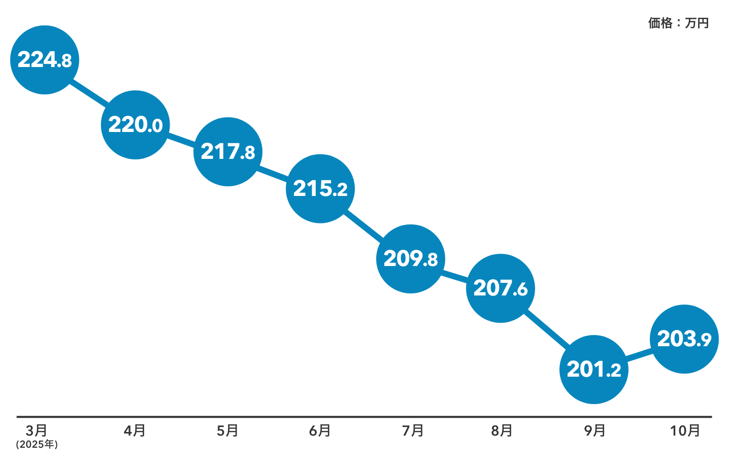2025年前半は220万円前後で推移していましたが、夏場から秋にかけて下落が続き、直近10月は200万円台前半に。相場が緩やかに下がり続けている点が特徴です。