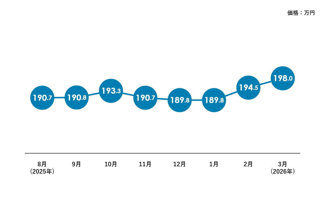 2025年後半は190万円前後で横ばいでしたが、2026年に入ってから価格は上昇しています。