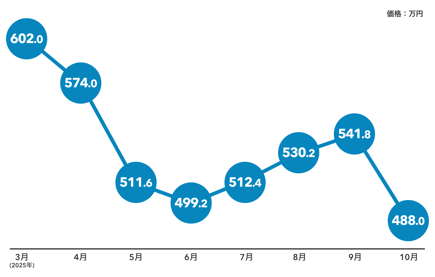 3月の602万円から下落が始まり、6月には499万円まで下落。その後7〜9月は一時的に持ち直して541万円をつけましたが、10月は488万円と再び大きく下落しました。