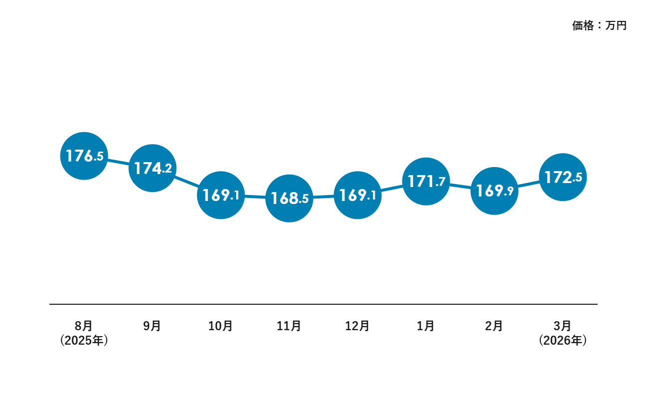 今回のデータでも170万円前後で価格が安定しているのは、需要と供給のバランスが大きく崩れていないためと考えられます。