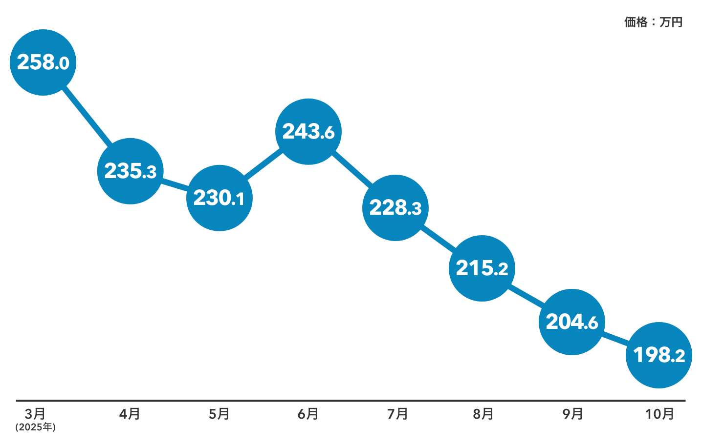 3月から6月にかけてはやや上下動を見せたものの、夏以降は全体的に下落傾向が続き、10月は200万円を下回る水準となりました。