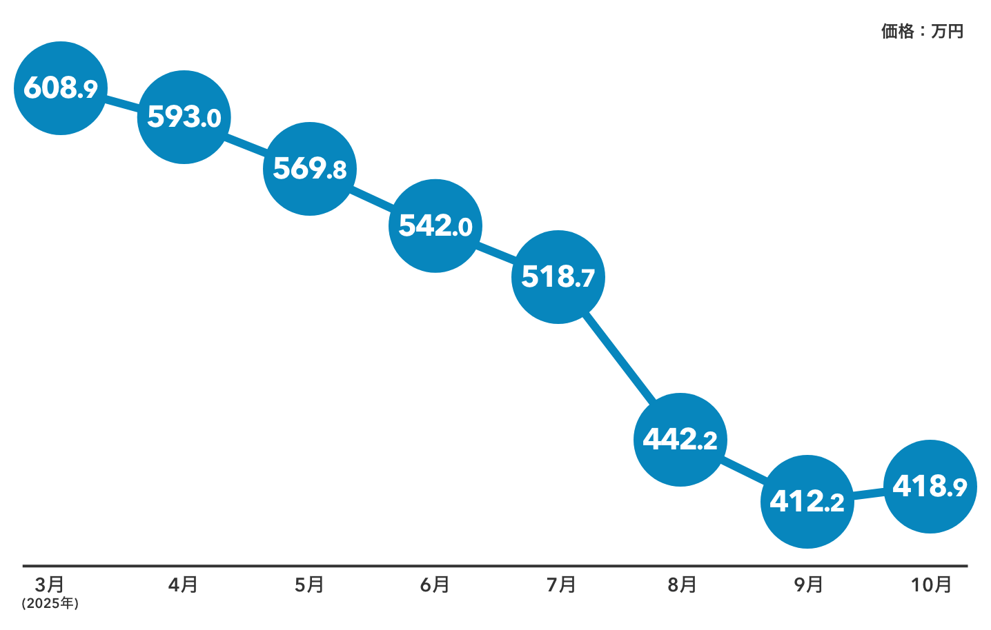 10月に入りやや反発して419万円を記録していますが、全体としては「長期下落トレンドの中の小幅回復」といえます。