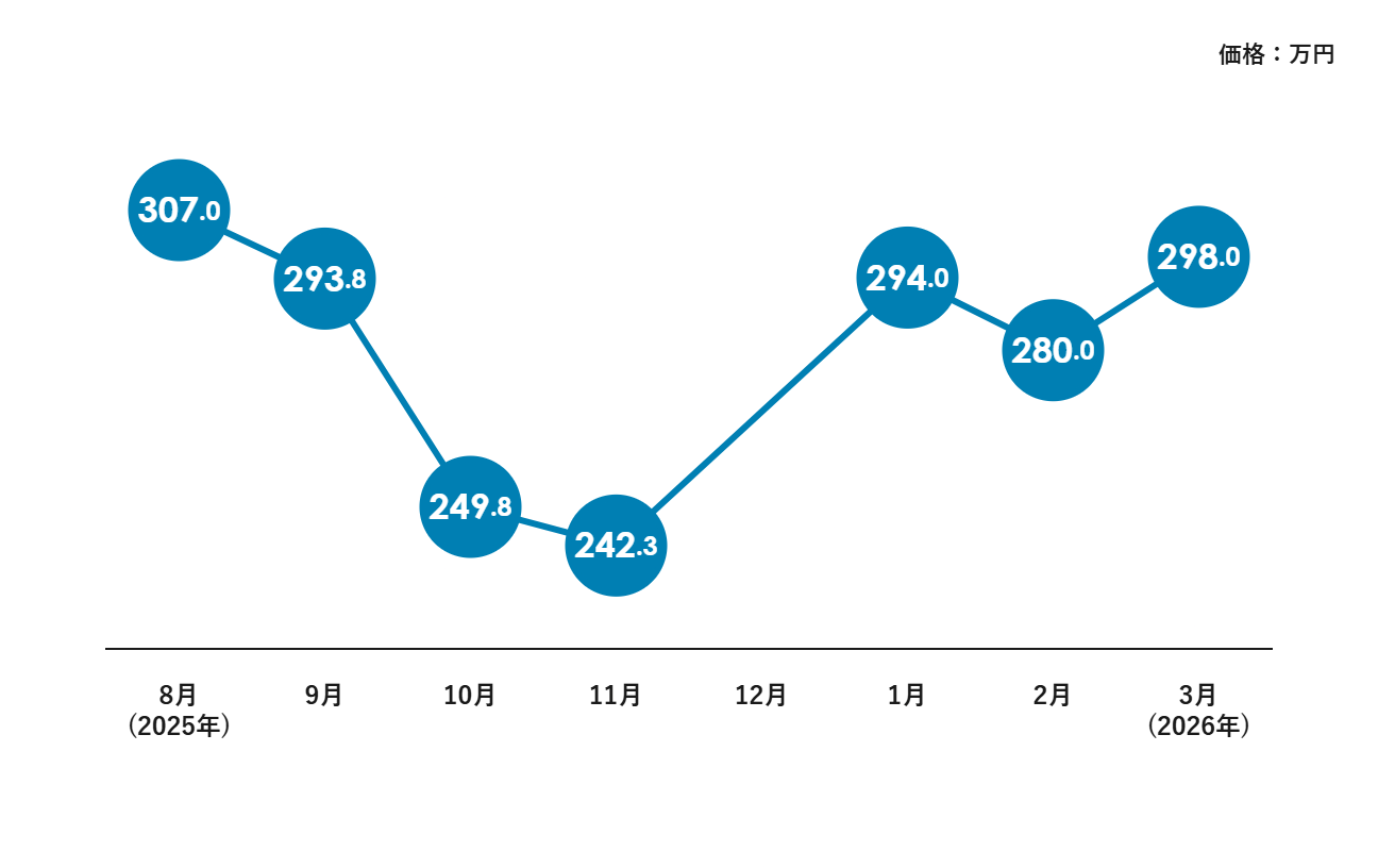 データ開始の2025年8月の307万円と比較すると、現在は約9万円の下落となっています。ただしこの期間は一貫した下落ではなく、2025年10月には249万円まで下落した後、2026年1月には294万円まで回復しています。