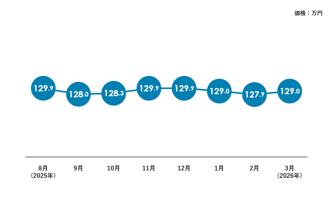 データ開始の2025年8月の129万円と比較すると、現在はほぼ横ばいとなっています。期間中の価格は128万円〜129万円台で推移しており、大きな上下は見られません。