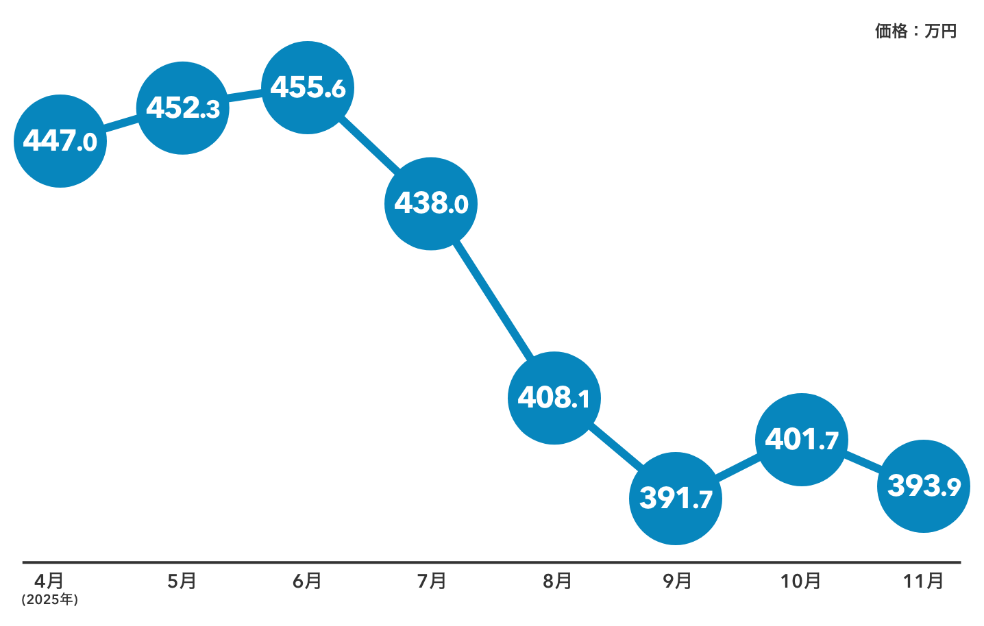9月の391.7万円からわずかに上昇し、相場の下げ止まりを感じさせる動きとなっています。