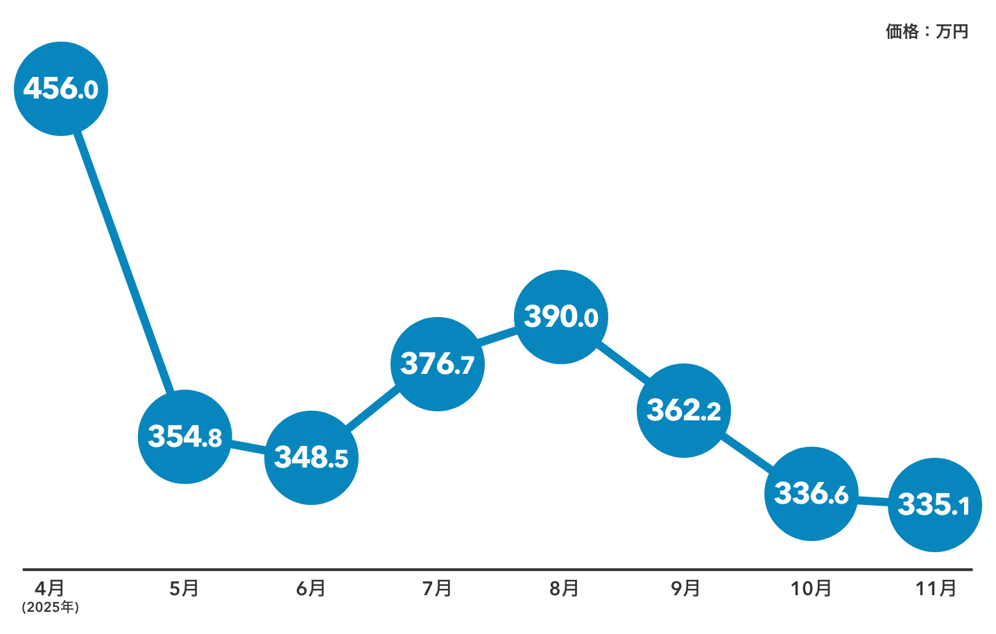 4月には456万円と高水準でしたが、以降は350万円前後を軸に推移しており、価格はやや調整傾向にあります。