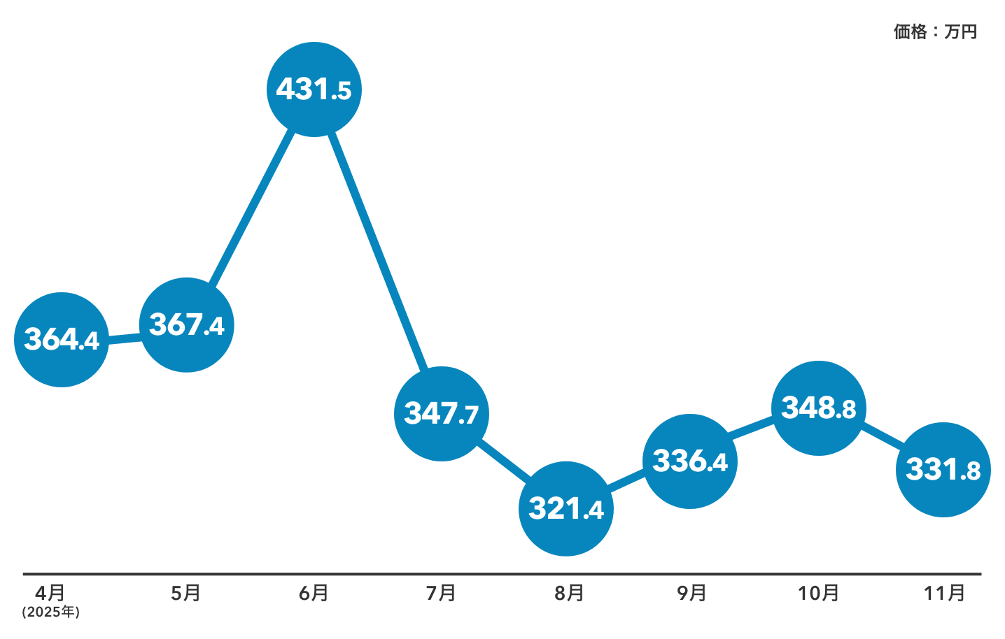 6月に431.5万円まで上昇したものの、その後は330〜350万円のレンジで推移しており、価格は落ち着いた状態を維持しています。