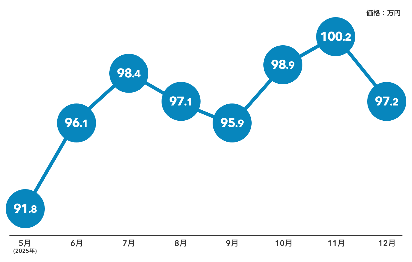 11月(100.2万円)からやや下落したものの、年間を通じて90万円台後半を維持しており、安定した相場といえます。