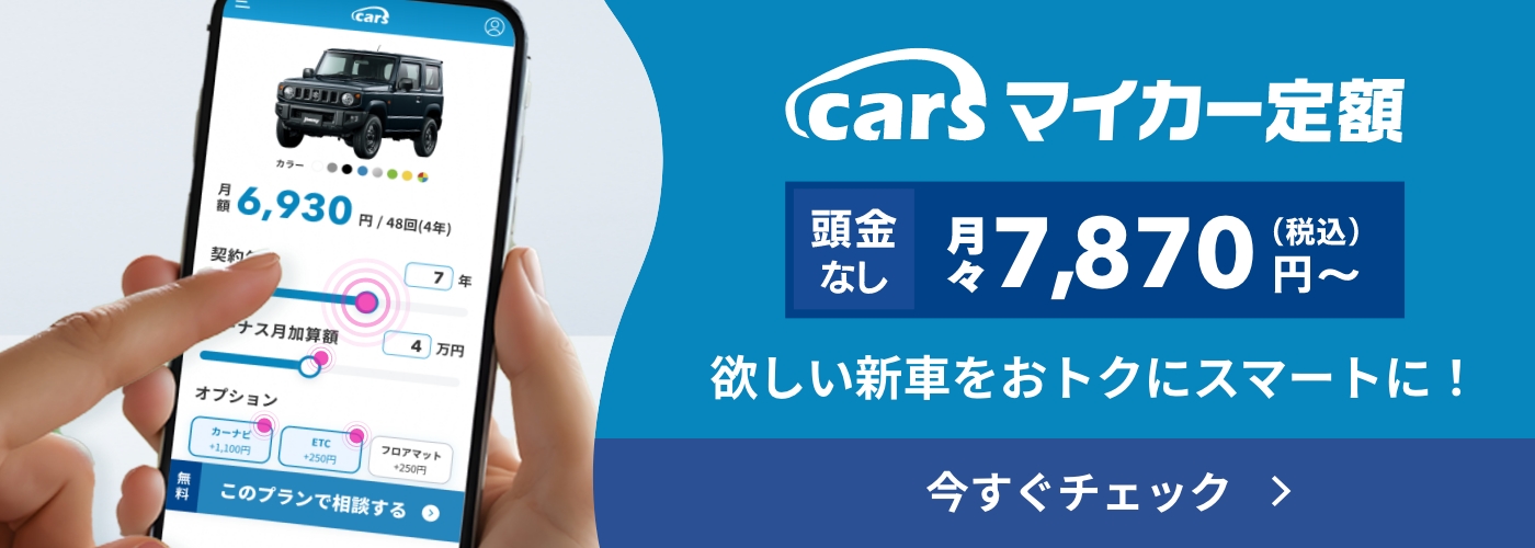 carsでは、月々7,870円〜利用できるカーリースサービス「carsマイカー定額」を提供しています。もちろん、初期費用・頭金0円、税金や自賠責、車検費用など全てコミコミです。