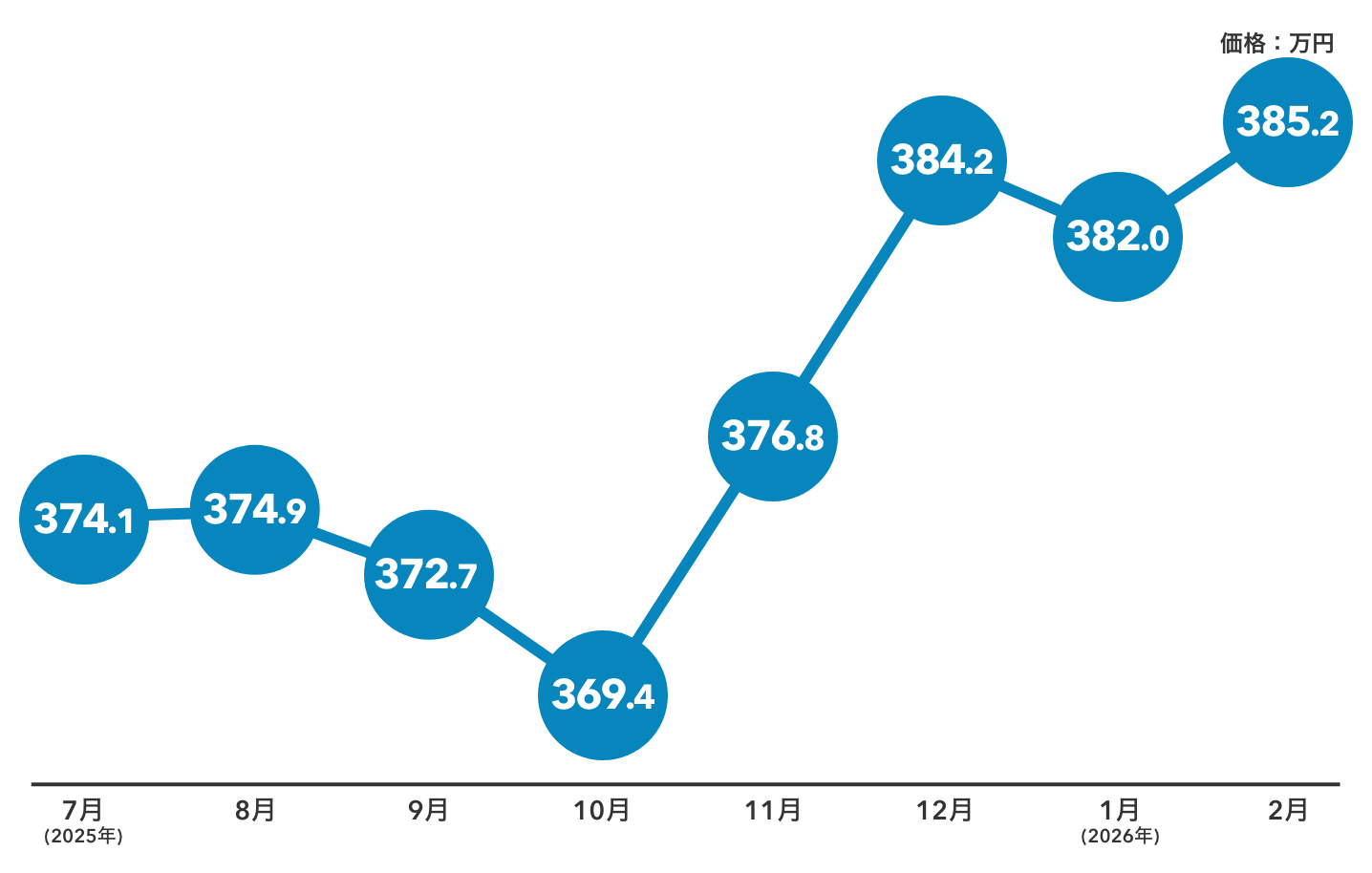 特に年末以降はアウトドア需要の高まりもあり、380万円台後半で安定した推移となっています。