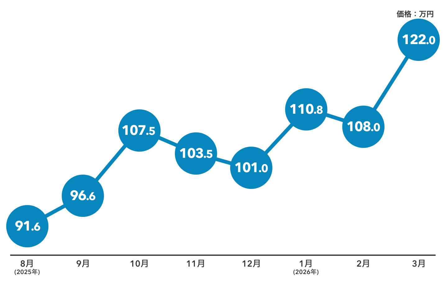 carsのAI査定データをもとに直近8か月の相場推移を確認してみましょう。