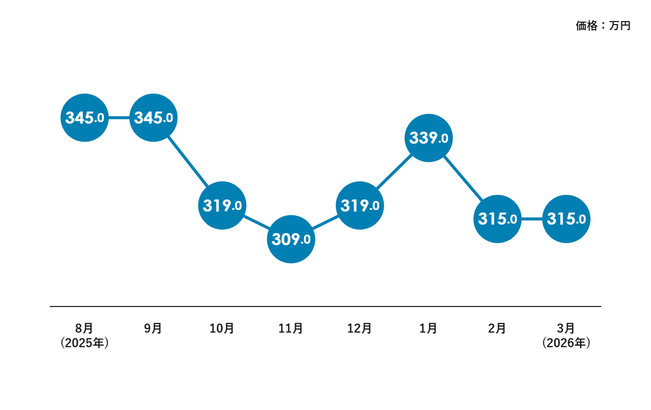 2025年10月には319万円まで下落し、11月には309万円まで価格調整が進みました。