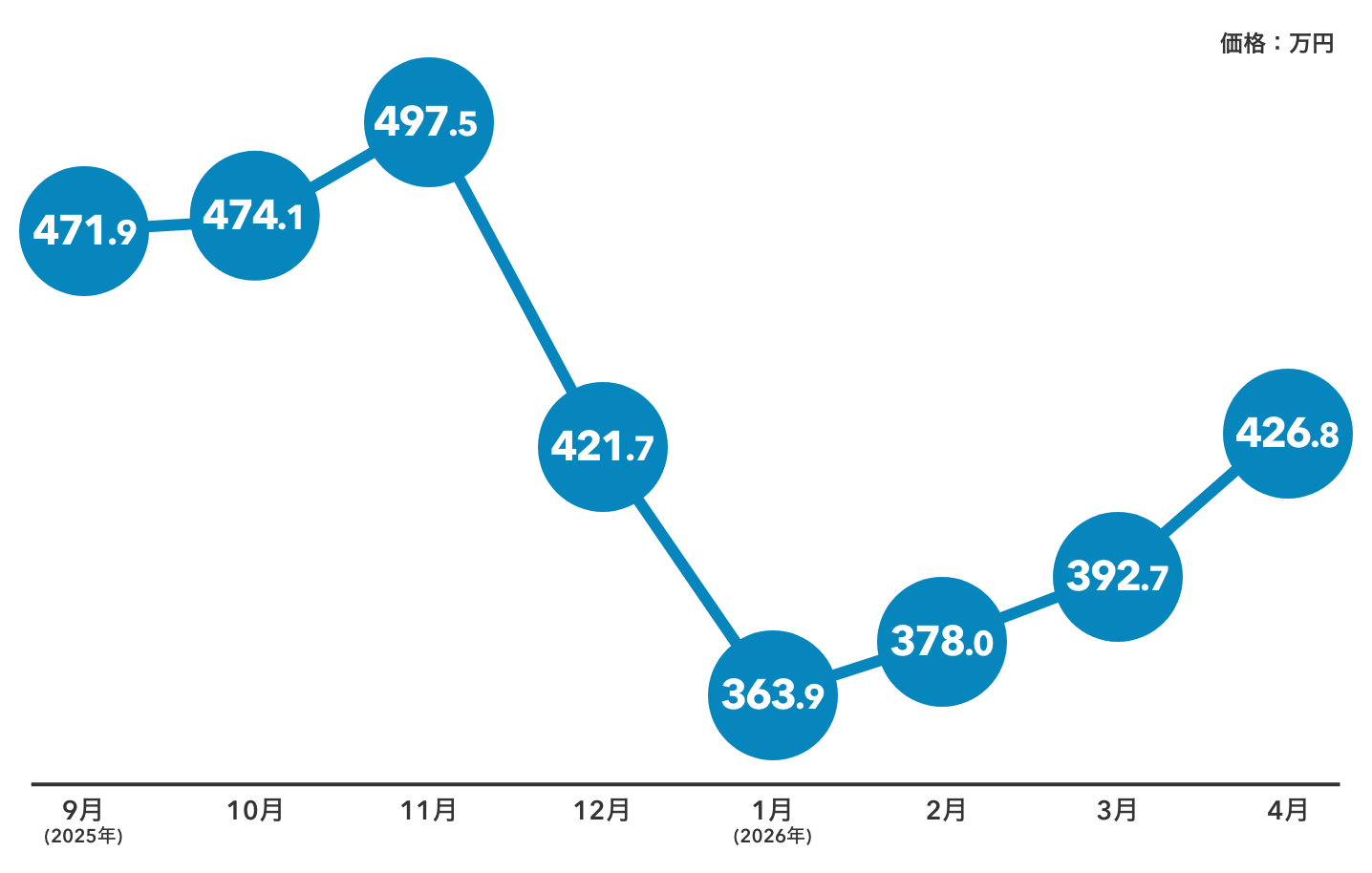 その後12月以降は大きく下落し、2026年1月には360万円台まで低下しました。