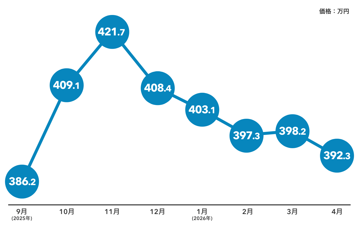 その後は徐々に価格を下げ、2026年に入ると390万円前後で推移しています。