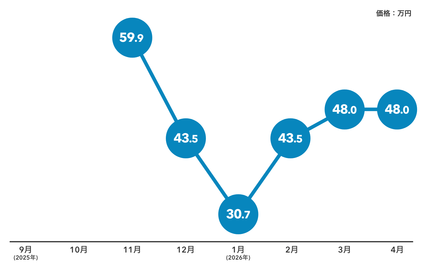 2025年11月に約59万円の水準が確認され、その後は40万円台へ下落しました。