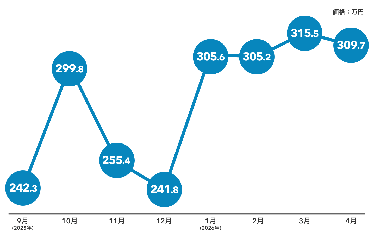 その後も上下を繰り返しながら上昇し、2026年3月には315万円まで到達しています。