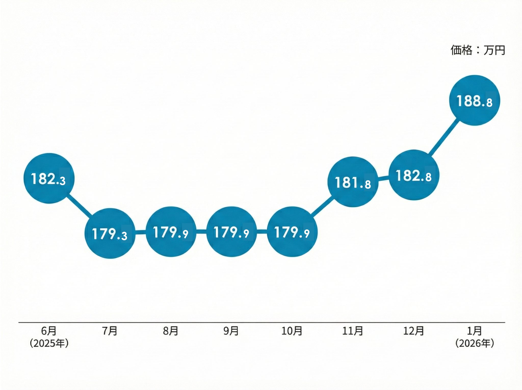 2025年7月に一度179万円台を記録しましたが、その後は179.9万円でピタリと止まる驚異の安定感を見せました。