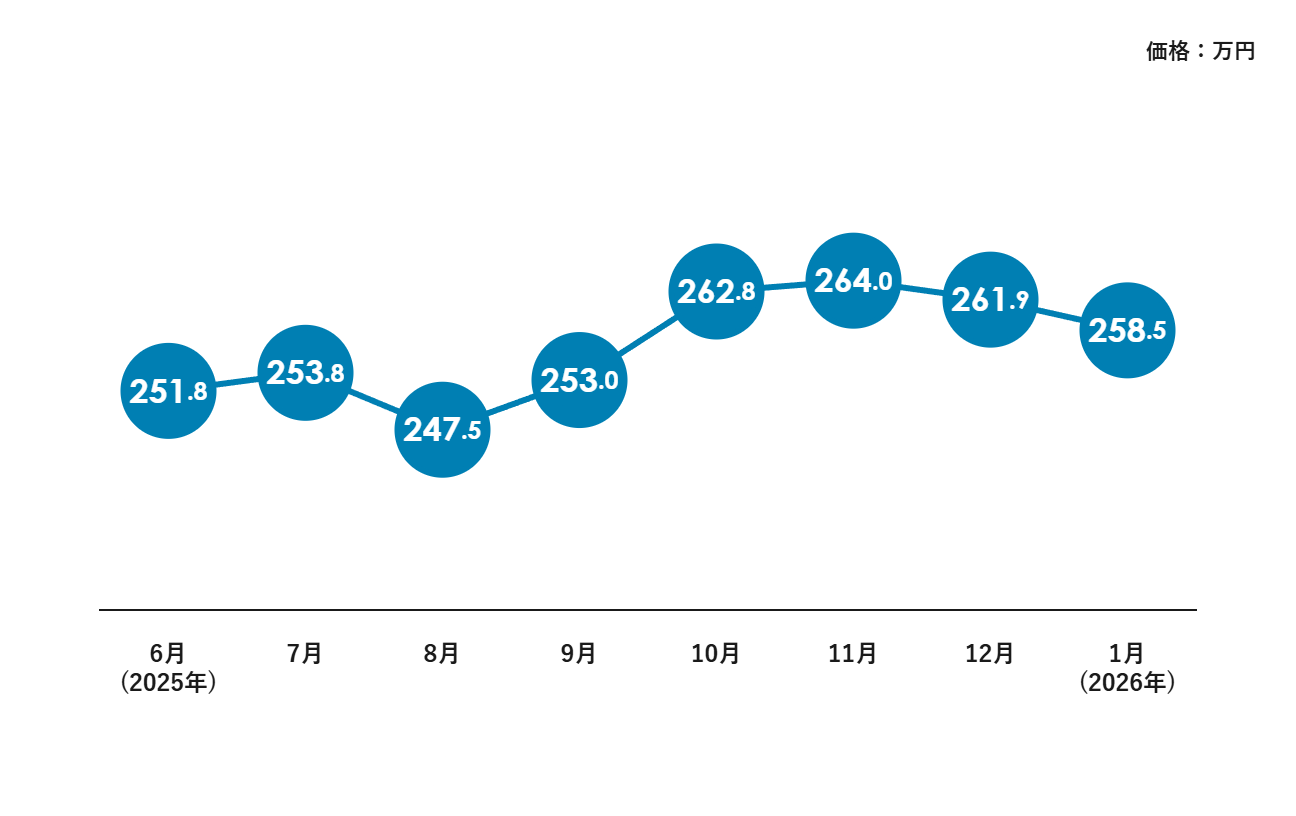 昨年秋口に260万円台まで上昇するピークを見せましたが、年末から1月にかけては緩やかな調整局面に入り、落ち着いた動きを見せています。