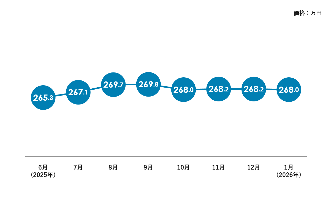 2025年の中盤以降は、大きな値崩れもなく260万円台後半での「安定した横ばい」の状態が続いています。
