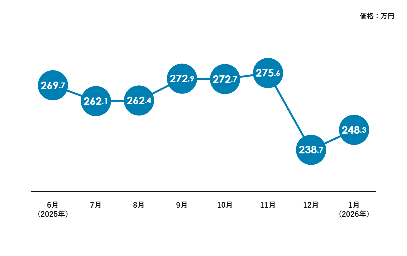 しかし、12月に238.7万円まで一時的に大きく数字を落としており、年末の在庫調整に伴う市場全体の冷え込みが相場を一時的に押し下げたことが分かります。