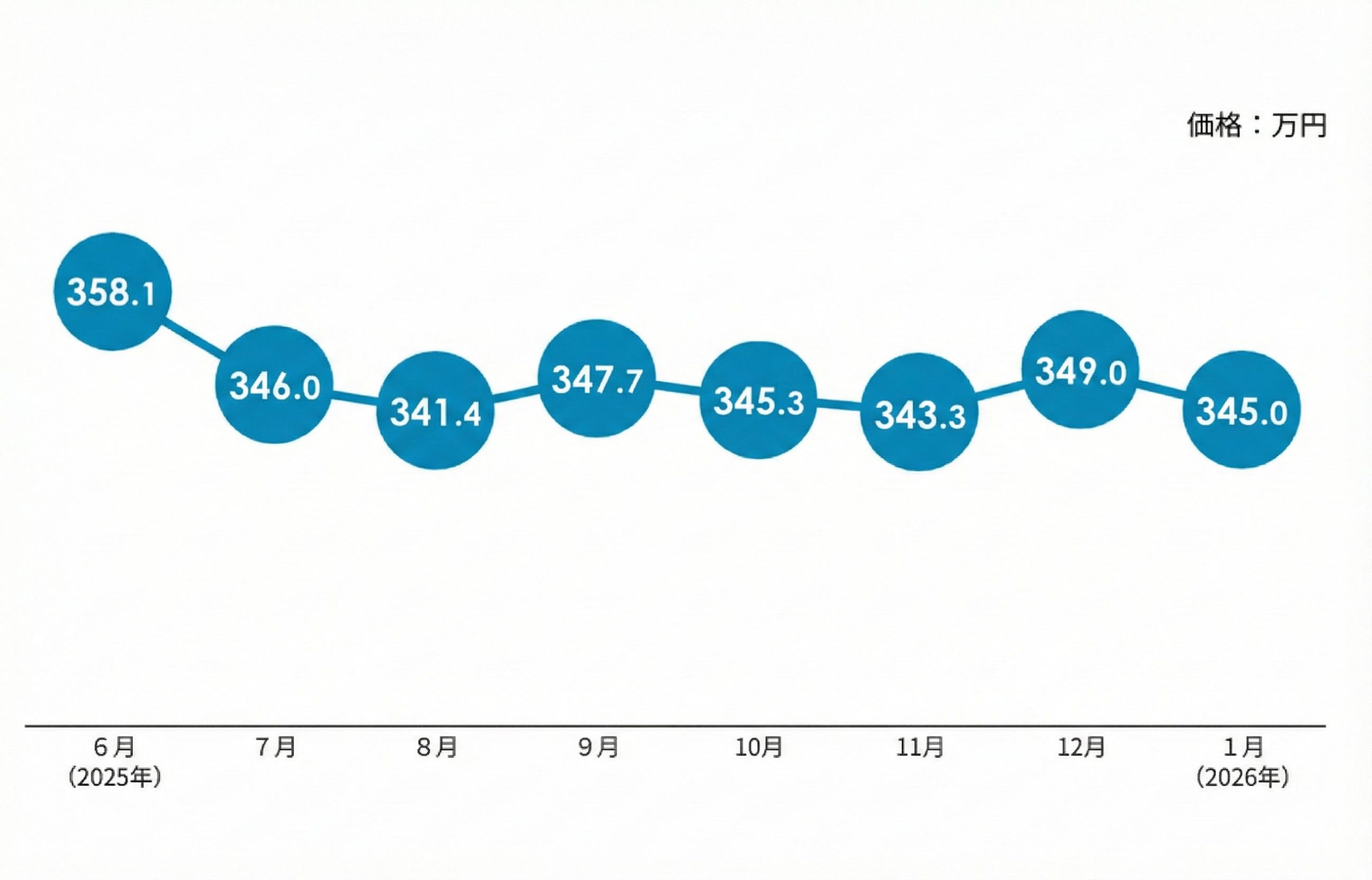 2026年1月は345.0万円と小幅な調整を見せましたが、これは年末の需要ピークが過ぎた直後の自然な変動範囲内です。