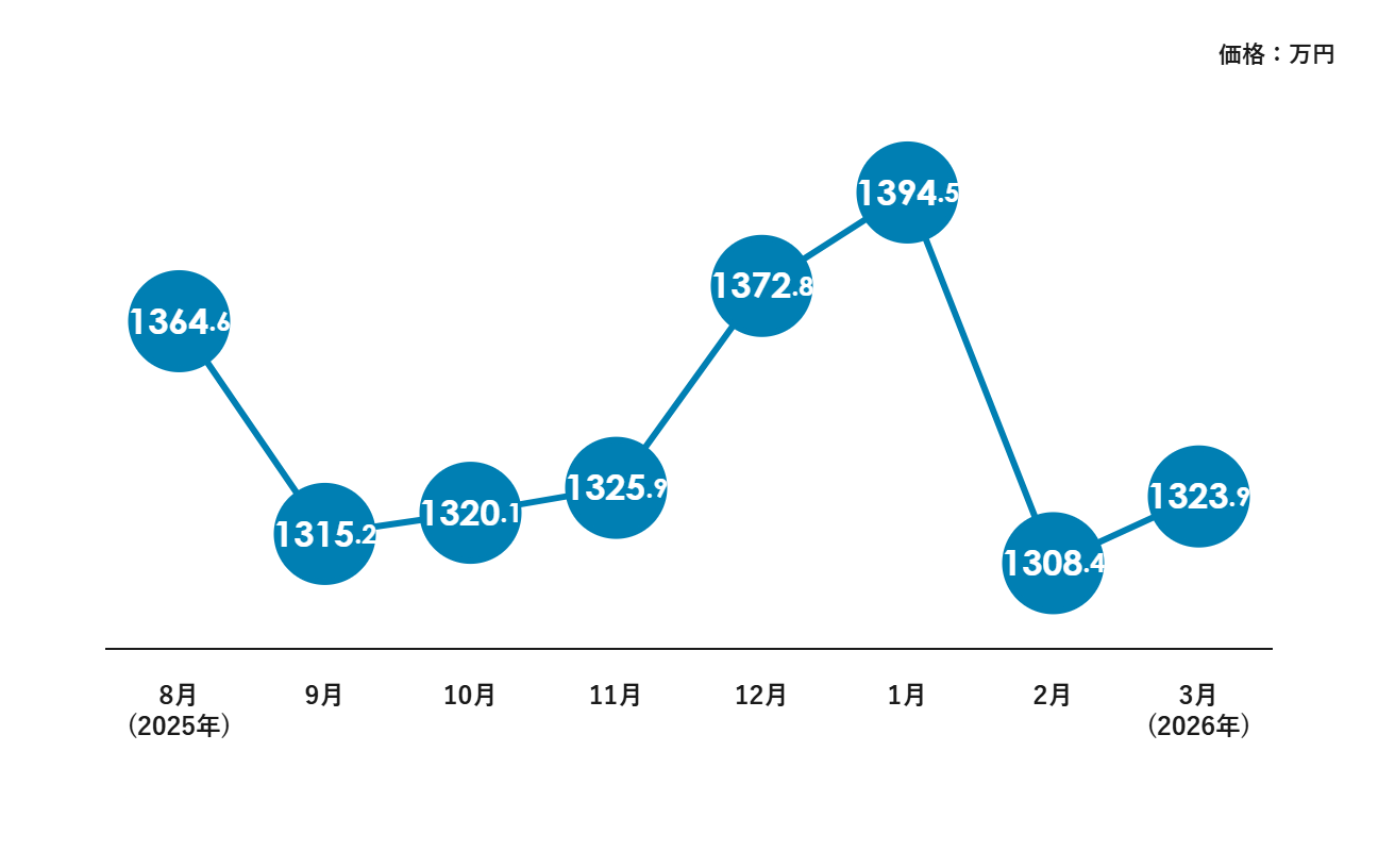 2025年秋までは1300万円台前半で推移していましたが、2025年末から2026年初頭にかけて価格が上昇しました。