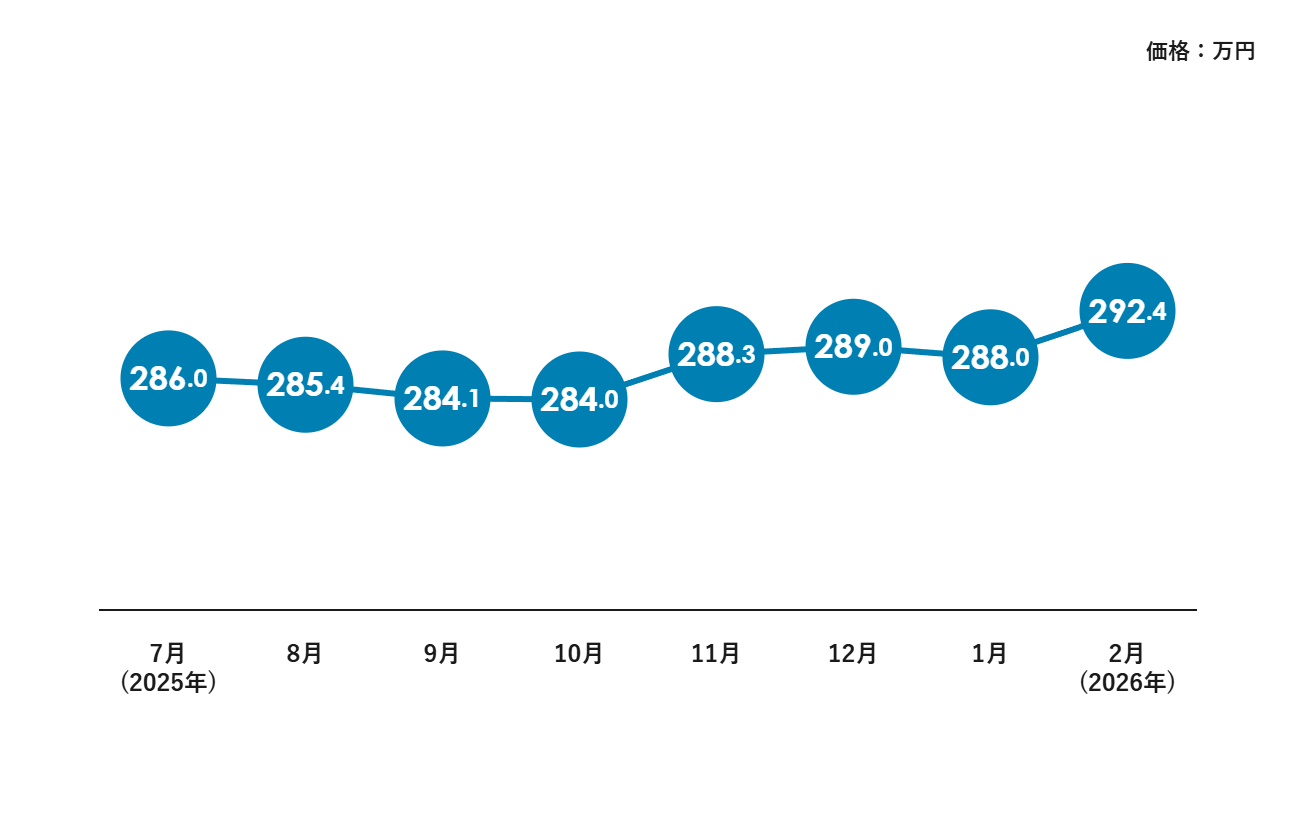 2025年7月の286万円と比較すると約+6万円の上昇となり、直近8ヶ月で最高値を更新しています。