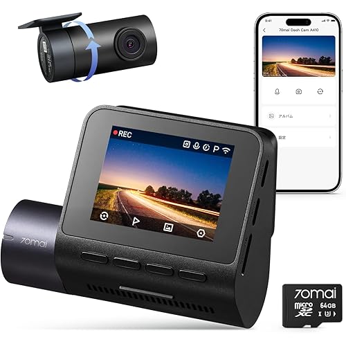 【前後2カメラ 370万画素超強暗視】 70mai Dash Cam A410ドライブレコーダー HDR搭載 F1.55 超広角 超強暗視 GPS 常時録画 衝撃録画 駐車監視 スマホ連携 パソコンと接続可能 技適認証済 全国LED信号対応ノイズ対策済 日本語取扱書 SDカード付属(64GB)